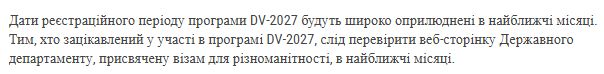 Про дати початку і закінчення реєстраціїї заявок для участі в Green Card лотерея DV-2027 буде оголошено в найближчі місяці.