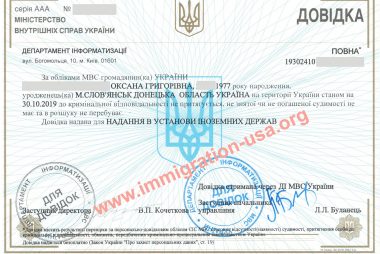 Справка о несудимости Украина — официальный документ, который выдается Министерством внутренних дел Украины и дает информацию об отсутствии судимости (или наличии) у человека, на имя которого она выдается. Справка об отсутствии судимости на территории Украины понадобится вам, если вы оформляете иммиграционную визу в США: Справка о несудимости Украина оформляется только на лиц, старше 14